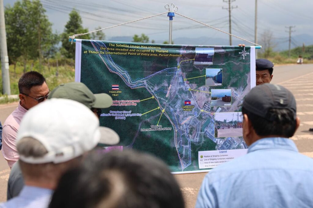 The statement was made by Deputy Prime Minister Prak Sokhon during his leadership of diplomats and representatives of United Nations agencies and international organizations in Cambodia to inspect the site at Thmada Commune, Veal Veng District, Pursat Province, Cambodia, on March 27, 2026, where the Thai military illegally occupied and continued to deploy container boats and fishing traps.