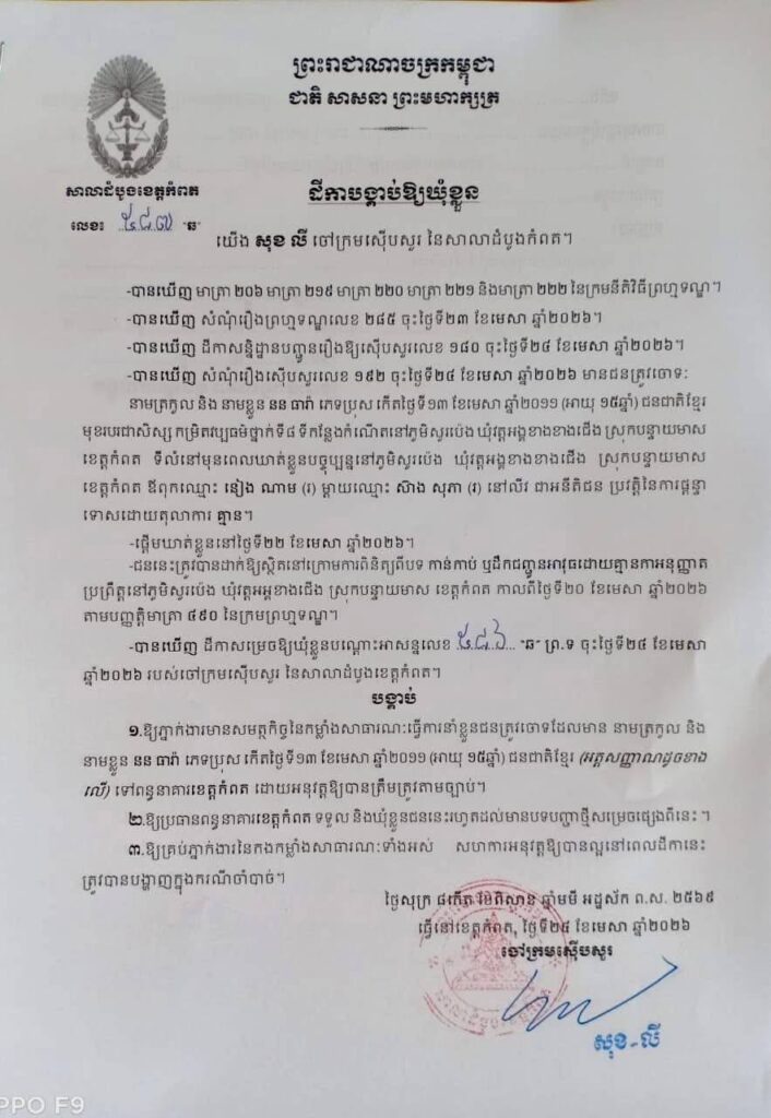 Based on photographic evidence and detention order No. 552 dated April 24, 2026, issued by the investigating judge of the Kampot Provincial Court, Mr. Sok Ly, decided to temporarily detain Non Dara, a 15-year-old youth, on charges of “possessing or transporting weapons without permission.”